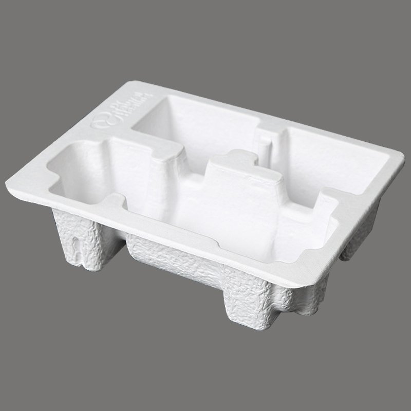 Molded pulp trays are formed from recycled paper fibers using a wet-pressing process that creates a rigid, impact-absorbing structure. The resulting tray has a natural matte surface and a dense fiber profile that performs well under compression and drop stress during shipping.