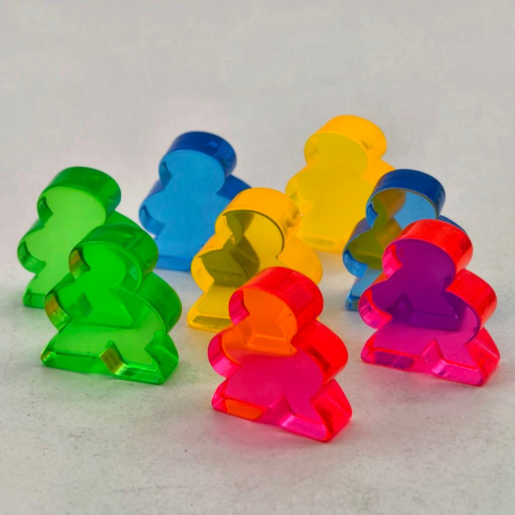 Acrylic meeples provide a premium visual effect with transparency or color saturation but require tighter process control.